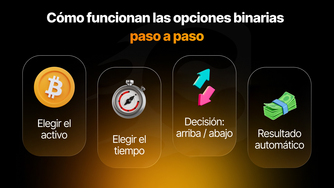 Step 1: Choose an asset (currency pair, stock, index, or commodity) Step 2: Select an expiration time based on your analysis Step 3: Decide whether the price will go up or down Step 4: Wait for the trade to close automatically at expiration